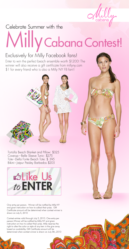 I would not be fit to call myself a frugal fashionista if I did not enter contests. I mean someone has to win, why not one of us? The lure of the free, especially when luxury goods are involved, has a very strong appeal. That is why I have to tell you that one of my favorite designers, Michelle Smith aka Milly is having a Cabana Contest on her Facebook page. To enter, you just have to join Milly’s Facebook page and click the Like Us button, then fill out the entry form. Milly gets a fan and you get an entry. It’s a very clever way for this talented designer to build her social media presence. I can’t wait until I receive my first Tweet from @Millyny! 🙂