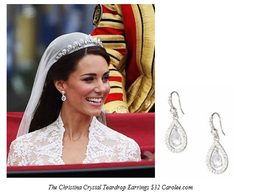 One thing that literally shone brightly at the Royal Wedding was the bride, Kate Middleton’s exquisite and very understated jewelry. I’ve never had the occasion to wear a Tiara , but if I did the 1936 Cartier Tiara that the Queen lent to Kate yesterday would fit the bill! The tiara is called the Halo Tiara, and it was a gift from the late Queen Mum to the her daughter, then Princess Elizabeth, when she turned 18. I wish someone in the Royal Family would wear the stunning Tiara more often, maybe it will be Kate. Then, there were the brilliant diamond teardrop earrings that the bride wore. The earrings were a gift from her parents designed by jeweler Robinson Pelham to compliment the Tiara. The pear shaped drop earrings had a little diamond acorn dangling in the center. The acorn is the new Middleton emblem on their coat of arms. By chance, I was looking for a similar pair on the Internet yesterday, and stumbled upon the Christina Teardrop earrings from website Carolee for $32.00. The earrings are a nice reflection of Kate’s style at a small price. They might be a nice Mother’s Day gift. 🙂