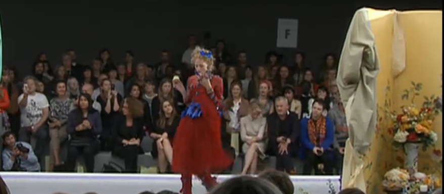 Emerging designers Meadham Kirchhoff took a flight of fancy today at London Fashion week at the Topshop show space with their Spring/Summer 2013 ” Cautionary Tale” show. Looking at the show stage, I thought I had stepped into Marie Antoinette’s decadent sitting room at Versailles replete with beautiful floral patterned screens and vases of fresh flowers. Just about the time I was thinking that and Tweeting that, out stepped a model in a fantastical red dress with blue ribbons sampling a piece of cake. A fitting allusion to Marie Antoinette’s alleged “Let them eat cake“remark.