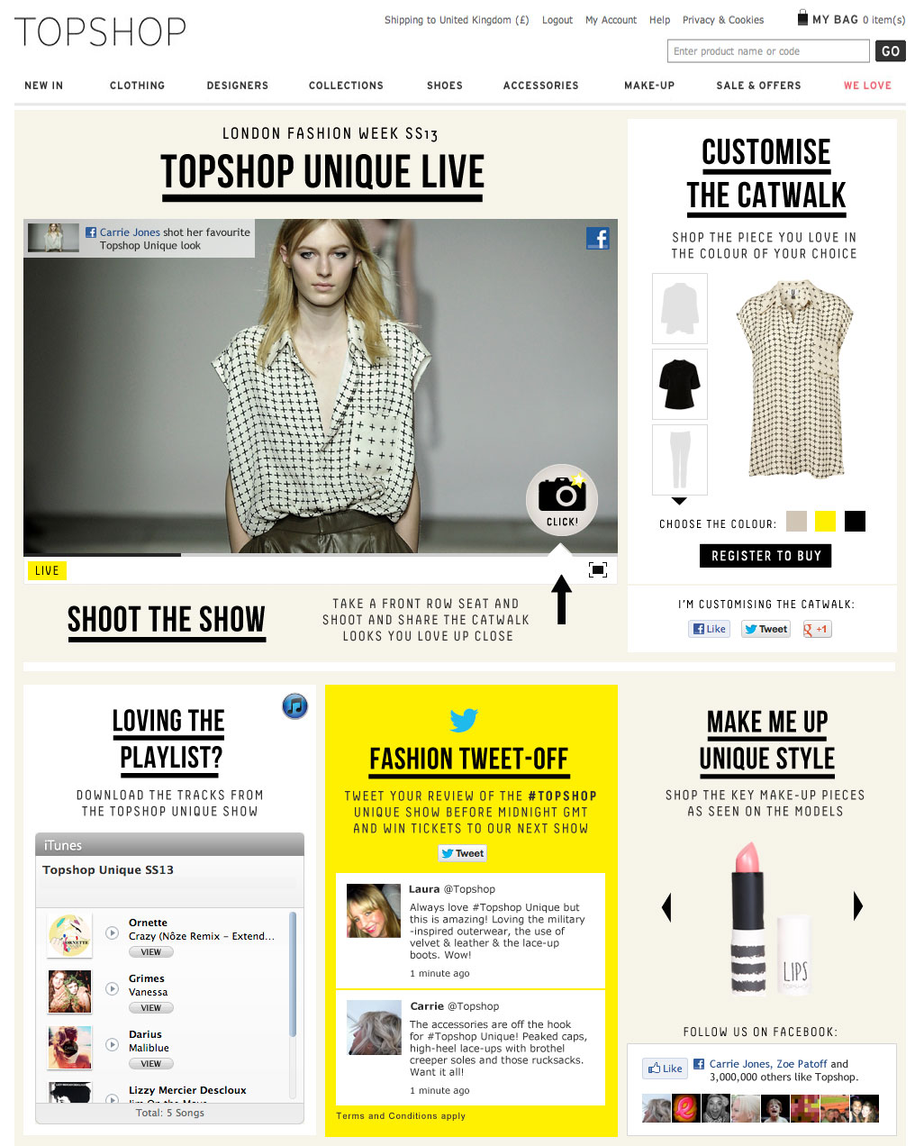 As with Burberry shows, and their Facebook page, music will be a crucial part of this experience. Visitors to the Topshop social experience be able to download music from the social site on Topshop.com from iTunes both during and after the show.