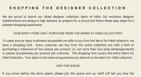 “The first 300 people in line will be given a colored bracelet; there are 10 colors with one for each group of 30 customers. Your color determines when it’s your time to shop in the designer collection area. Each group will have 15 minutes to shop, with 5 minutes between slots. The bracelets are only for customers shopping the Marni collection and are used to shorten the queue and make your shopping experience easier. ”