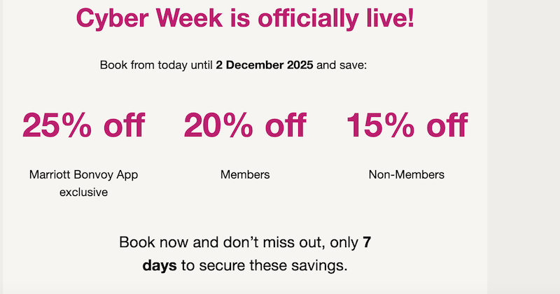 These special deals are available for just 7 days, until Dec 2, 2025. Below are the discounts available for the Marriott Hotel Cyber Week Deals: