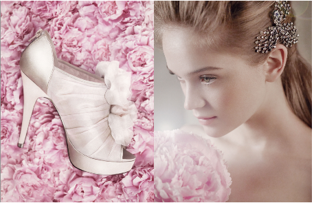 The merchandising evolution of the fashions of Vera Wang fascinates me. At the beginning of this recession (that we still find ourselves in) she reinvented herself with Simply Vera, a lower priced fashion line for Kohl’s. She made no apologies for that, admitting that funding from her partnership with Kohl’s would help her continue as a designer. Her bridal gowns, once so expensive and coveted, can now be found for more more reasonable prices at David’s Bridal. There’s even a replica of Kim Kardashian’s wedding dress. Her new Spring 2012 collection for David’s features plenty of Flower Power in the shape of fabric rosettes on her gowns and bridesmaid dresses. As you can see from the picture above, the floral embellishments on the dresses include organza petals and soft petal prints. There are also floral-inspired accessories, like organza flower booties, crystal orchid hair accessories and floral sashes.
