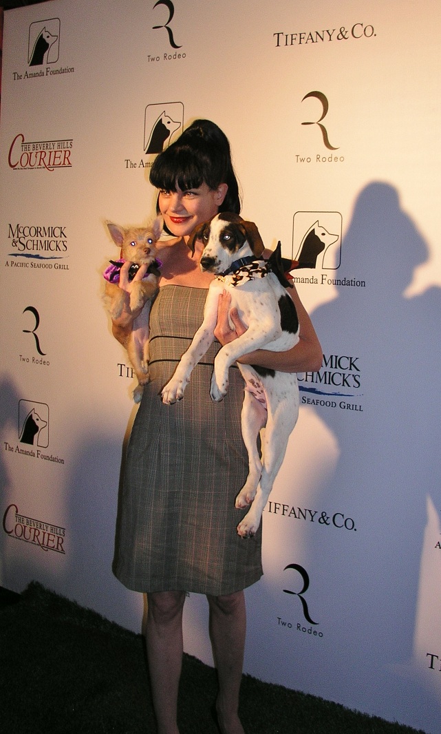 This week animal lovers turned out to support pet adoptions at a Halloween styled party in Beverly Hills. Halloween literally went to the dogs, as the Amanda Foundation put on their Annual Halloween Fete to encourage pet adoptions. The Amanda Foundation rescues dogs who have been abandoned or abused and then places them in good homes. Following the event, dog adoptions went on in twenty-one of the most posh stores in Beverly Hills. Celebrities and fashionistas Pauley Perrette (from TV’s NCIS) and actress Kristin Bauer (from HBO’s True Blood) turned up at the event to help the Amanda Foundation raise funds and find the dogs some good homes. Pauly Perrette is a big supporter of the Amanda Foundation and adopted her two dogs from them. Pauly showed not only her love for her pet’s at the event, but some great style. I asked her about her wonderful black vintage looking coat. She told me, ” I wanted to show off a little Audrey style.” Audrey style indeed! I fell in love with this swing style black coat, with rounded peter pan type collar topped with a tasteful little bumble bee pin/brooch at the collar.