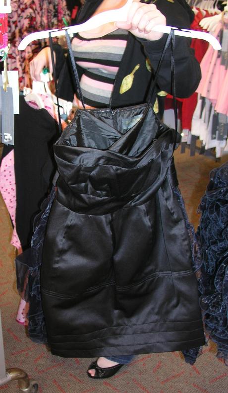 First up, if you are getting ready for prom, good news, some of these dresses will be great for you. A good value is actually the two piece ruffled dress. Although it’s priced at $80.00 it’s really a 2 for 1. The skirt with the little ruffles is detachable from the straight lined, strapless, boned bodice dress. I preferred the dress in black with the midnight blue detachable skirt, as the two colors together were striking. The dress also comes in red. If you can wear it, or have something to wear it to, this is a good looking dress. Here’s the inside of the dress held by helpful fashionista Stacie.
